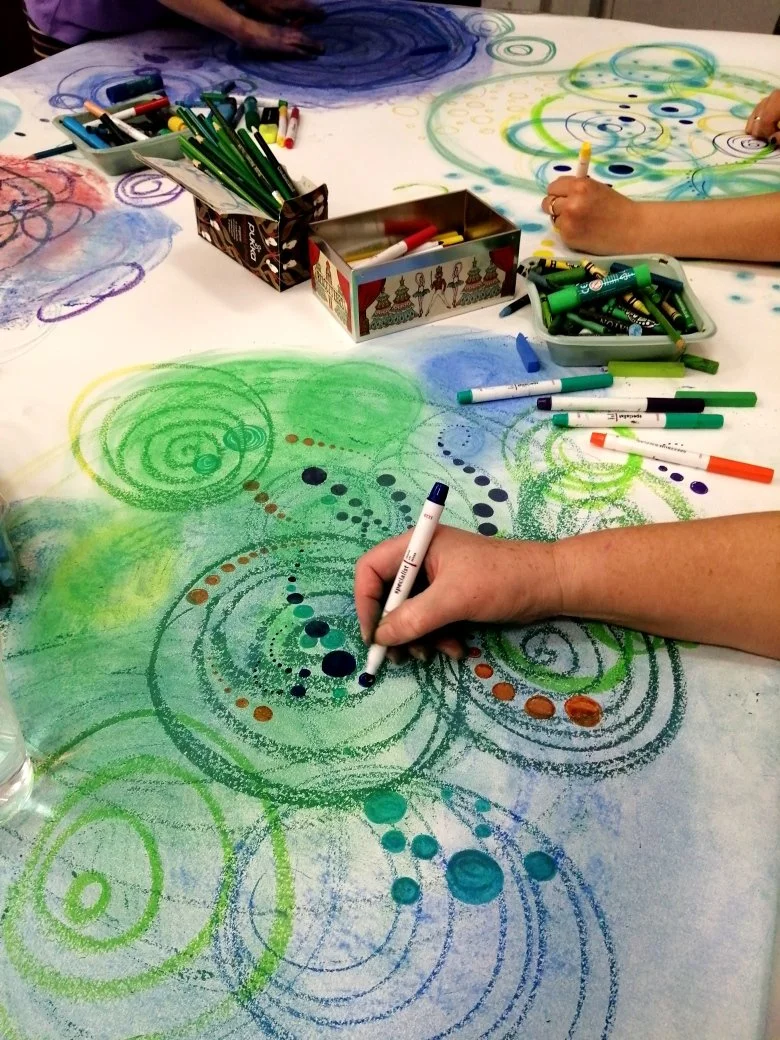 You will begin by making many marks in a variety of mediums and colours on a very large communal piece of paper.